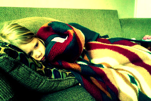 Now the kid’s on the couch with a glazed look on her face that could be due to the shots or the ugliness that is my favorite fuzzy blanket. Both?